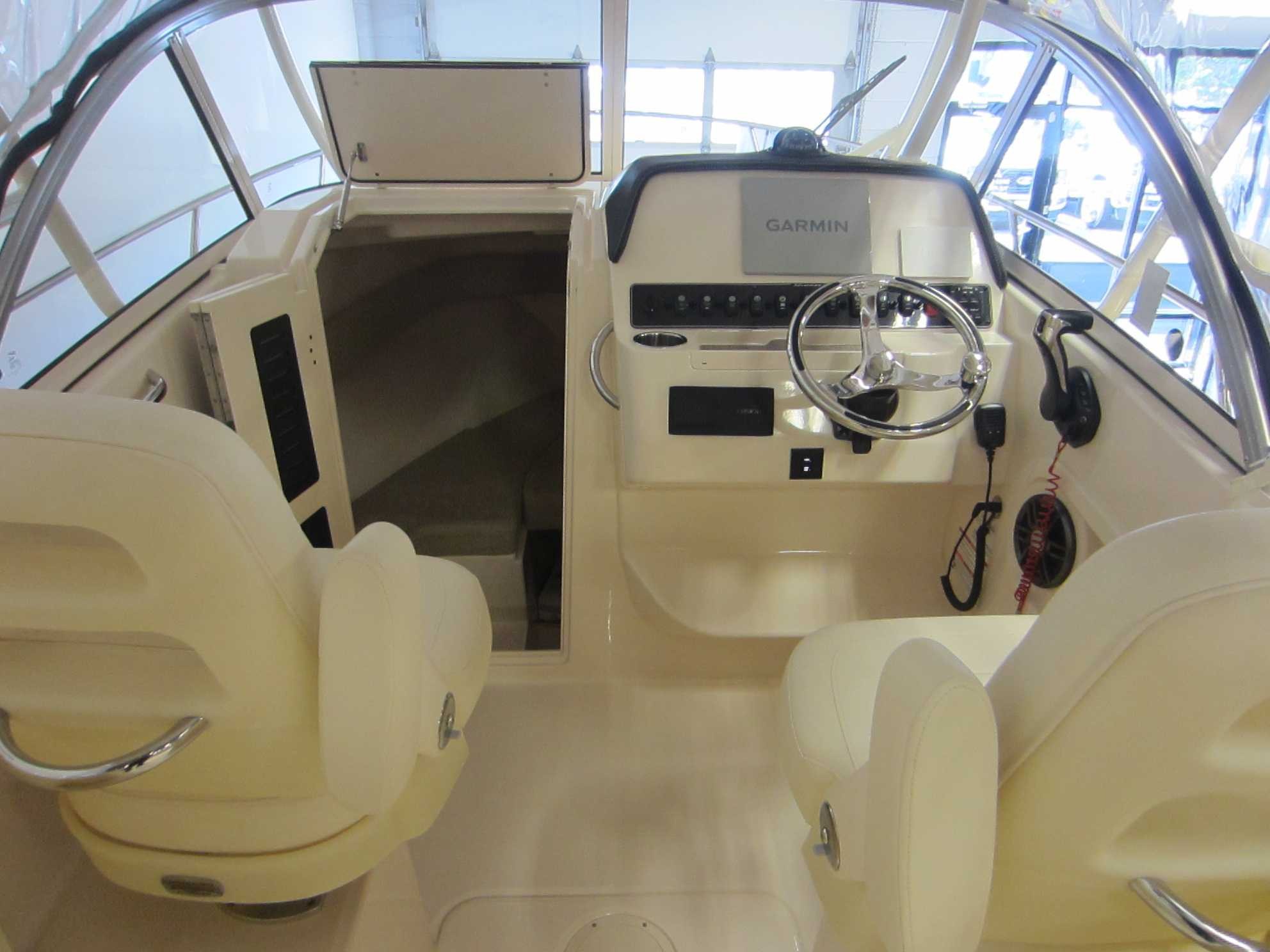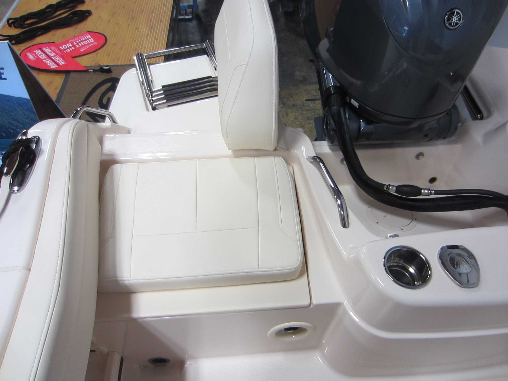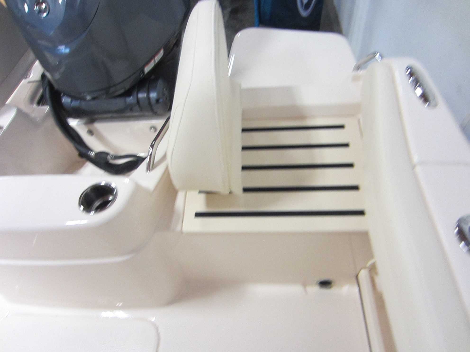 - Safety Automatic Bilge Pump (1100 GPH) (4164 LPH) Basic Flotation Bow Rail - 316 Grade Stainless Steel Cockpit toe Rails Composite Stringer System & Transom - Water Impervious Fire Extinguisher Holder Nonskid Fiberglass Liner Nonskid Recessed Walkaround Self-Bailing Cockpit w/Cockpit Drains (2) Stainless Steel Through-Hull Fittings Cabin Berth - Forward vee Berth Door - Lockable w/Screen & Companionway Hatch Forward Hatch - Low Profile Acrylic Hatch w/Screen Head - Portable with Dedicated Storage Lighting - Indirect Throughout Rod Storage - Horizontal (4) Storage - Under Berth Compartment Windows - Opening Windows w/Screens (2) Cockpit & Deck 100% Hand Laid Seav Hull & Deck Accessory Outlet - 12V (2) Batteries (2) w/Battery Select Switch (1) Cleats - Flush Mount (Pull up) Cockpit Bolsters Cockpit Lights - Blue LED Compass Companion Grab Rail Deck Hardware - 316 Grade Stainless Steel Through-Bolted Drink Holders - Stainless Steel (9) Engine Flush System w/Hose Attachment Aft Factory Engine pre-Rigging Fish box - 100-qt. (94.6 l) Port Insulated Fish box w/ob Drain Fish box - 106-qt. (100.3 l) Starboard Insulated Fish box w/ob Drain Flush Mount Electronics Area Footrests - Helm & Companion Hydraulic Trim Tabs w/Indicator & Retractor International Lighting Rod Holders (4) Rod Storage Racks - Horizontal (6) Rubrail - High Density PVC w/Stainless Steel Insert Seating - Aft Jump Seats (2) w/Innovative Swing-Open, WalkThrough Backrests & Reversible Self-Stowing Cushions w/non-Skid Safety Treads Seating - Deluxe I Helm & Companion Chair (2) Seating - Port & Starboard Fish box Cushions Steering - Hydraulic Tilt Steering Wheel - 316 Grade Stainless Steel w/Knob Stereo System w/Waterproof Touch Screen Display, AM/FM Tuner & Wi-Fi & Bluetooth Connectivity; Speakers - Helm (2), Cockpit (2) Stern Eyes - 316 Grade Stainless Steel Storage - Aft Lift Out Boxes (2) Storage - Forward Anchor Locker w/Rode Storage Storage - Lockable Storage box Swim Platforms - Aft Port & Starboard Extensions w/Starboard Ladder Vista Top w/Front,